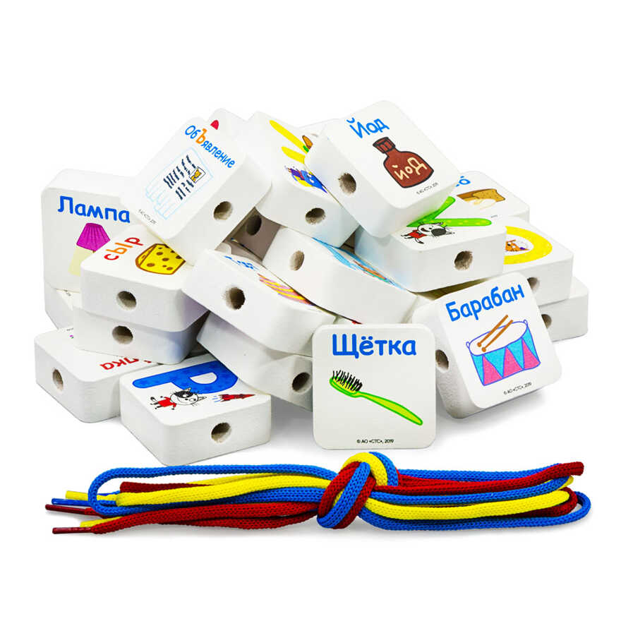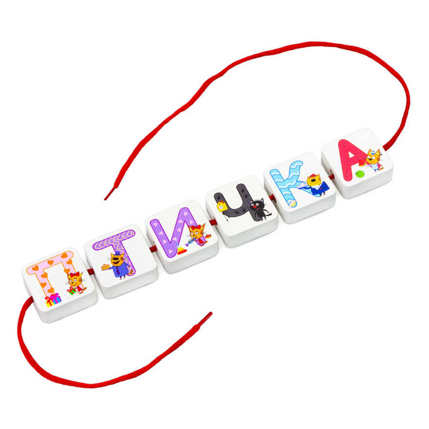 Alatoys Шнуровка-бусы Азбука Три кота – это набор из 33 кубиков с буквами русского алфавита, который комплектуется цветными шнурками для создания оригинальной цепочки.