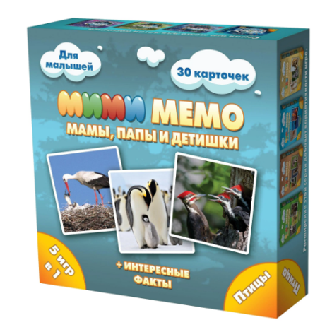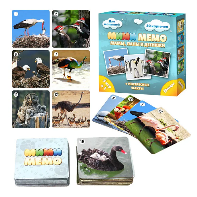 Мими Мемо Птицы – набор, в котором собраны потрясающе яркие фотографии живой природы. На парных карточках запечатлены мамы, папы и их детишки. Посмотрите, как интересен и необычен мир пернатых!