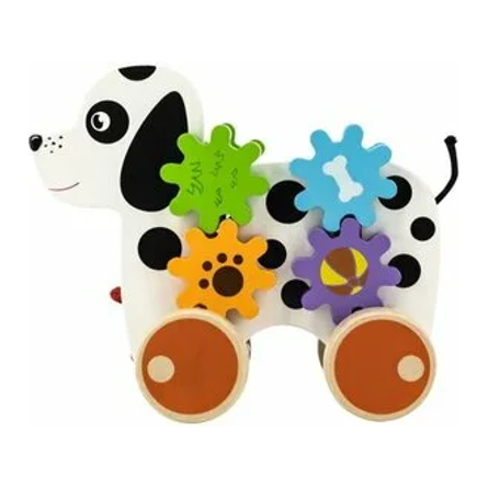 При движении щенок привлекает к себе внимание вращающимися шестернями. Забавный яркий щенок будет всюду сопровождать своего маленького хозяина. Яркая красочная игрушка изготовлена из экологически чистого материала-дерева.
