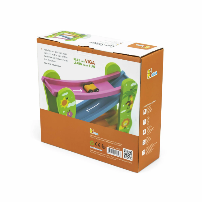 Это красочный развивающий набор для мальчиков от 18 месяцев. Детский автотрек состоит из деревянной ярко-салатовой основы с летним принтом (солнце, пальмы, экзотические животные) и 4 изогнутых уровней разных цветов (розовый, желтый, оранжевый, синий). В наборе также 4 игрушечные машинки. Маленькие и маневренные, они легко скользят по треку сверху вниз. Помимо радости от игры, этот набор развивающих игрушек приносит детям огромную пользу: улучшает координацию руки-глаза, мелкую моторику, тренирует цветовое восприятие, активизирует воображение. С помощью такой игры родители могут легко усадить подвижного ребенка и занять его на какое-то время. Малыши, играя с автотреками, становятся более ловкими и сообразительными.