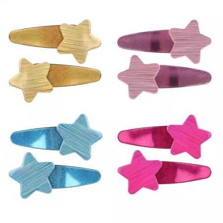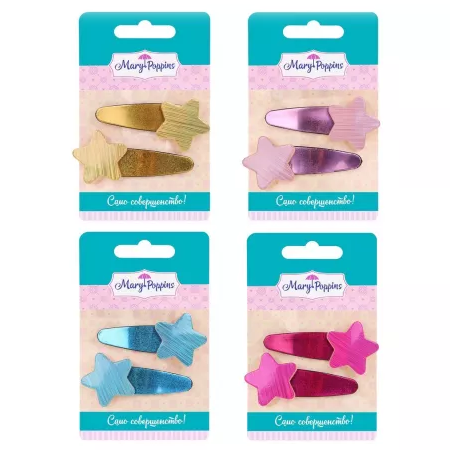 В комплекте – 2 заколки клик-клак, декорированные звёздами. Цветовые варианты представлены в ассортименте.
