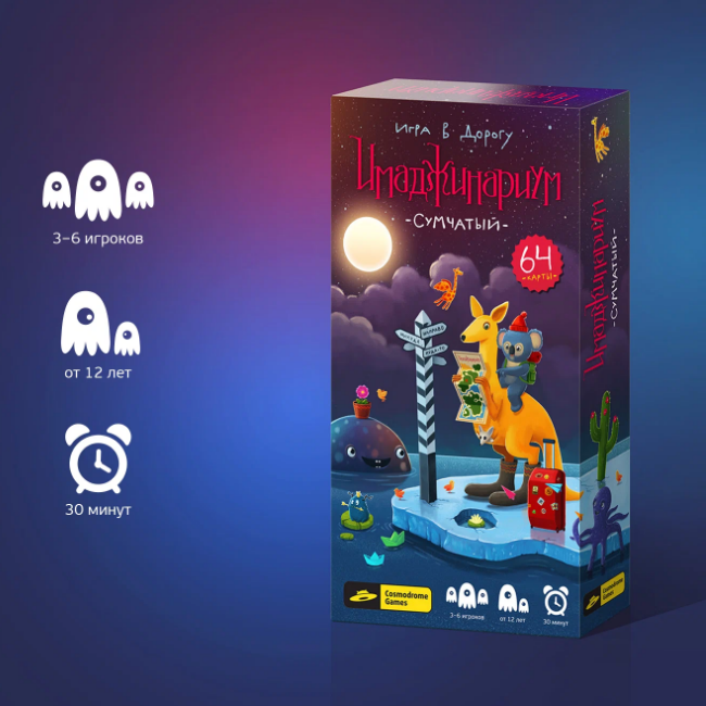 Встречаи?те новыи? «Сумчатыи?» Имаджинариум! Теперь его всегда можно взять с собои?: в дорогу или на пикник. Для игры не потребуется много места, а эмоции? будет все так же через краи?. Проведите незабываемые часы в компании отличных иллюстрации? и абсурдных ассоциации? ваших друзеи?, близких или случаи?ных попутчиков. Мы позаботились о тех, кто хочет играть в дороге — фишки теперь крепятся на игровое поле. Внутри вы также наи?дете новые карты. Погрузитесь в мир снов и иллюзии?, мечтании? и приятных воспоминании? с совершенно новыми картами!