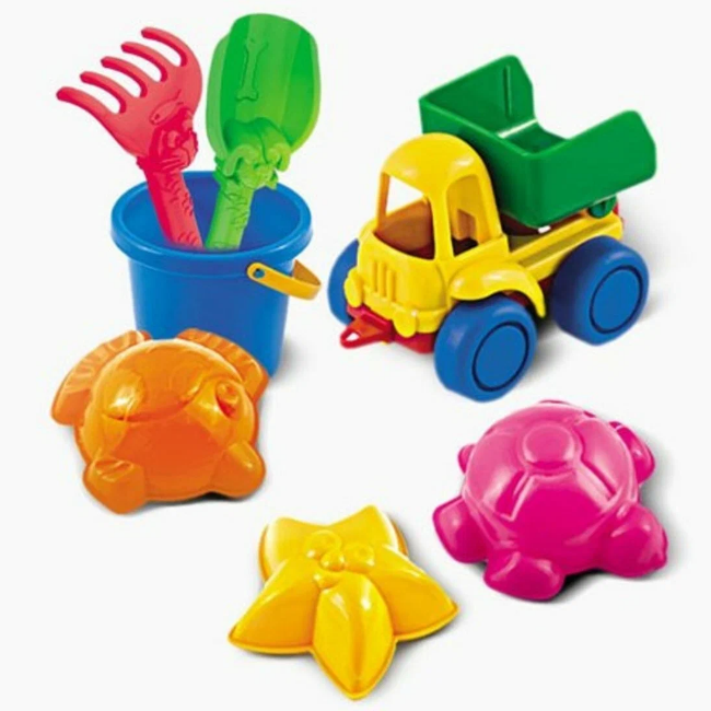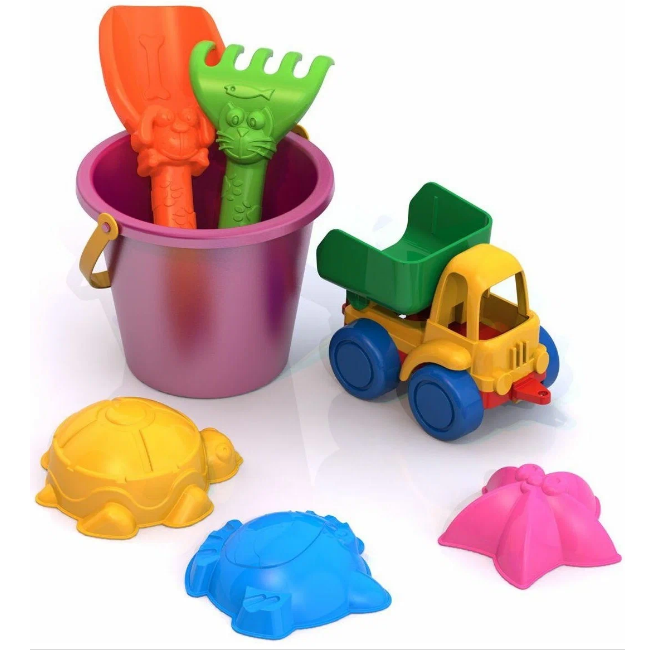 Комплектация: формочки “Морские”, самосвал “Нордик”, ведро, грабли, совок.