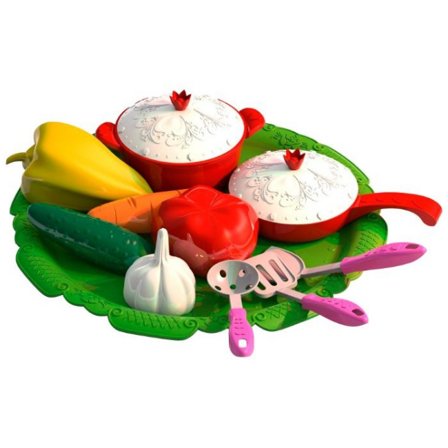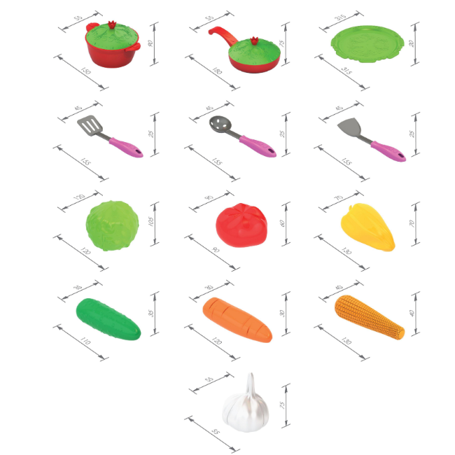 Комплектация: 1 перец, 1 помидор, 1 огурец, 1 морковь, 1 чеснок, 1 кастрюля, 1 сковорода, 2 крышки, 1 шумовка, 2 лопатки, 1 поднос.