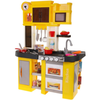 Кухонный игровой набор состоит из 26 предметов посуды: кастрюля и сотейник с прозрачными крышками, сковорода – 1 шт., сахарница с крышкой – 1 шт., кофейник с крышкой – 1 шт., тарелка – 4 шт., ложка – 4 шт., чашка – 4 шт., лопатка – 1 шт., шумовка – 1 шт., картофелемялка – 1 шт., половник – 1 шт.