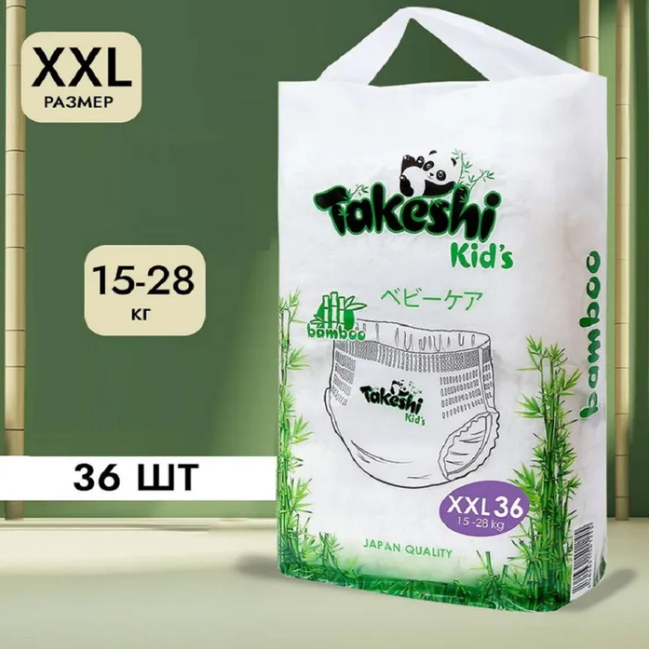 Подгузники-трусики для детей бамбуковые Takeshi Kid’s (Такеши)! Главной особенностью продукции является содержание в составе чистой бамбуковой целлюлозы, которая обладает рядом существенных преимуществ перед другими материалами: противомикробные свойства – бамбук является натуральным природным антисептиком, бактерии в нем не размножаются, высокая гигроскопичность, быстрое и обильное влагопоглощение, блокирование запаха внутри.
