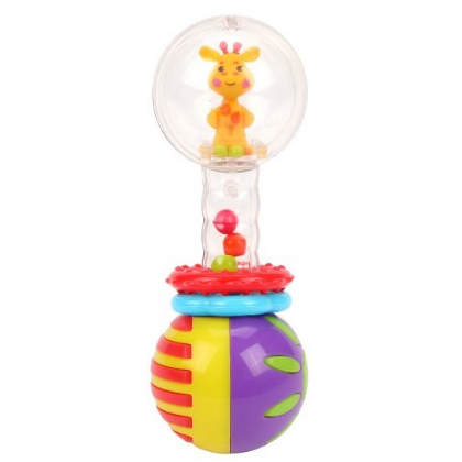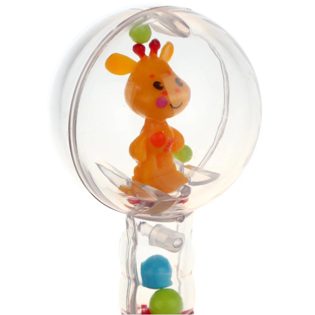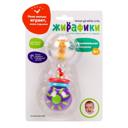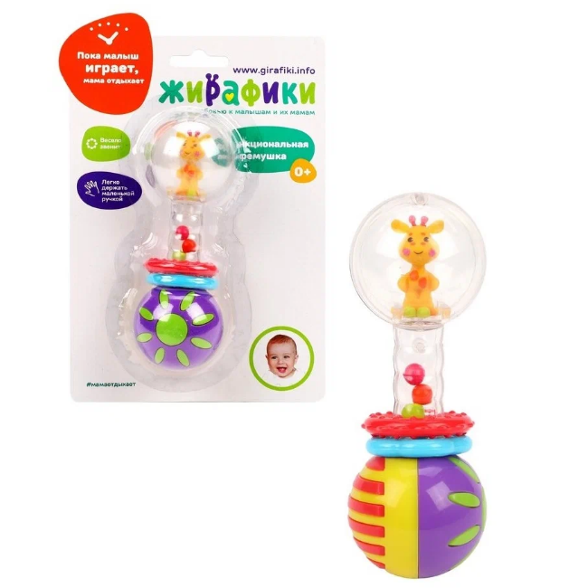 Внутри погремушки – очаровательная фигурка маленького жирафика и разноцветные шарики, которые очень весело гремят при встряхивании.