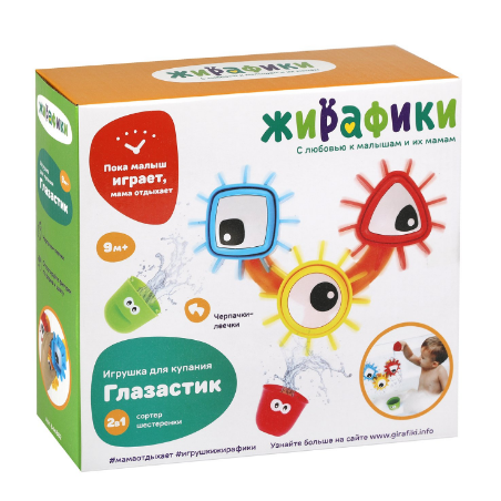 Весёлая игрушка для купания “Глазастик” работает по принципу водяной мельницы. Сначала её необходимо прикрепить на стенку ванной при помощи присоски, а затем попросить малыша собрать её самостоятельно, отсортировав фигурки по форме и цвету.
