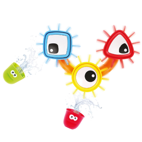 - Поливая “Глазастика” водичкой из черпачка, малыш будет восторженно наблюдать, как весело вращаются разноцветные шестерёнки!