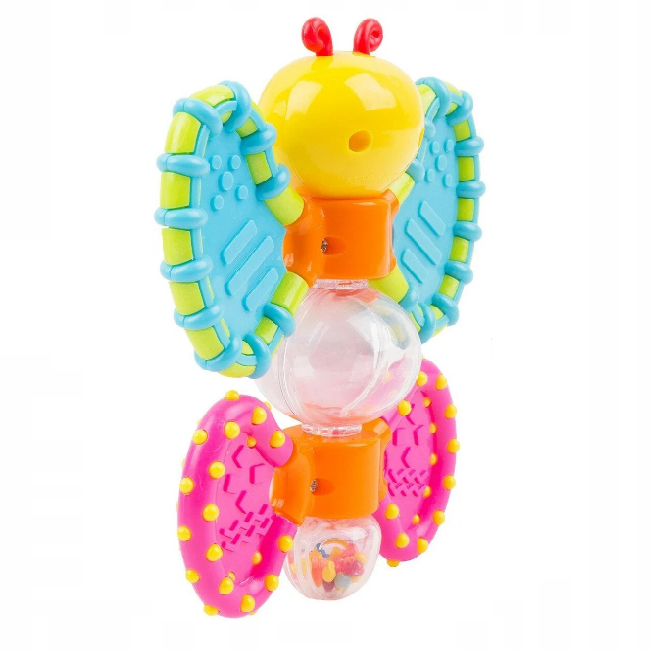 Погремушка-трещотка «Бабочка» надолго станет одной из самых любимых игрушек малыша. Яркие, выполненные в насыщенной цветовой гамме крылышки бабочки можно поворачивать по кругу, и при каждом таком повороте будет слышен весёлый трескучий звук! Внутри прозрачных сегментов игрушки расположены разноцветные шарики, которые очень приятно гремят при встряхивании. Туловище бабочки сделано из элементов разных красочных цветов с различным фактурным рисунком для развития у малыша тактильных ощущений.